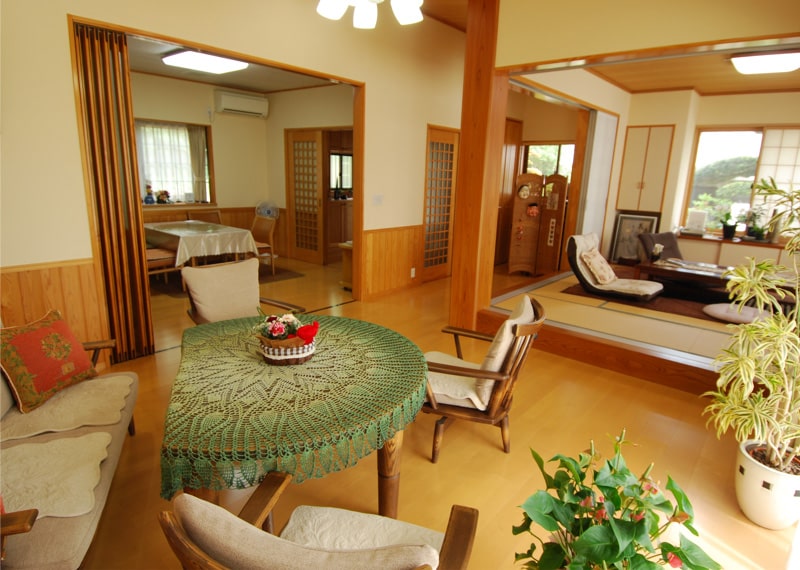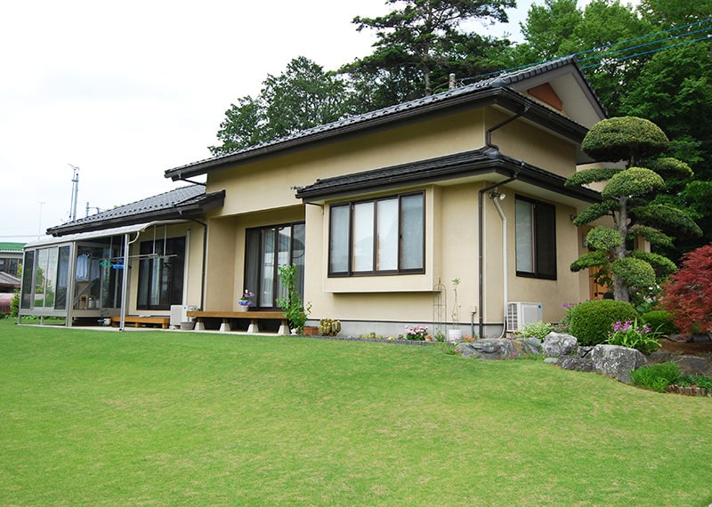 広い敷地を活かした平屋住宅です。奥様のご意見を中心に設計に取り入れさせていただきました。平屋でも高さが確保できるように4Mの柱を使用しています。自然の優しさや健康にも配慮して、玄関・リビング・トイレにもふんだんに無垢材を使用、壁は珪藻土を塗りました。 リビングには小上がりの和室を配置しましたが、掘り炬燵もある純和風の8畳間です。天窓をつけることで十分な採光も取れます。