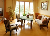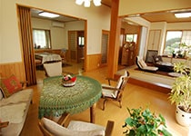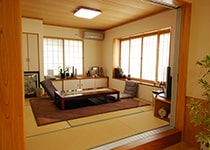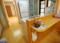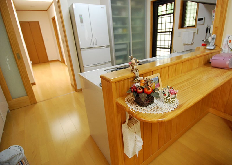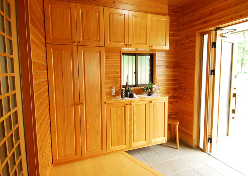 玄関に大きな収納、物がいっぱい入って嬉しいです。また、食器棚にシステムキッチン、オール電化でI.Hキッチンにして良かったです。ゆったりしたリビング、腰壁に杉板を張り、腰壁の上は珪藻土、天井に桧フローリングを張りました。隣に純和風の和室8帖が有り(掘りコタツ付き)一番落着く部屋です。広く取ったトイレも同じく杉板張り、珪藻土でとても落着きます。