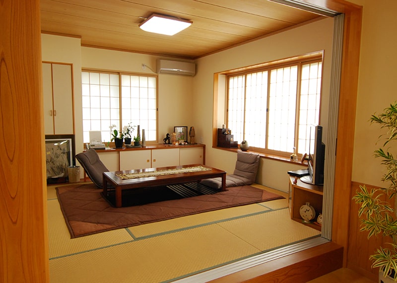 リビングには小上がりの和室を配置しましたが、掘り炬燵もある純和風の8畳間です。天窓をつけることで十分な採光も取れます。