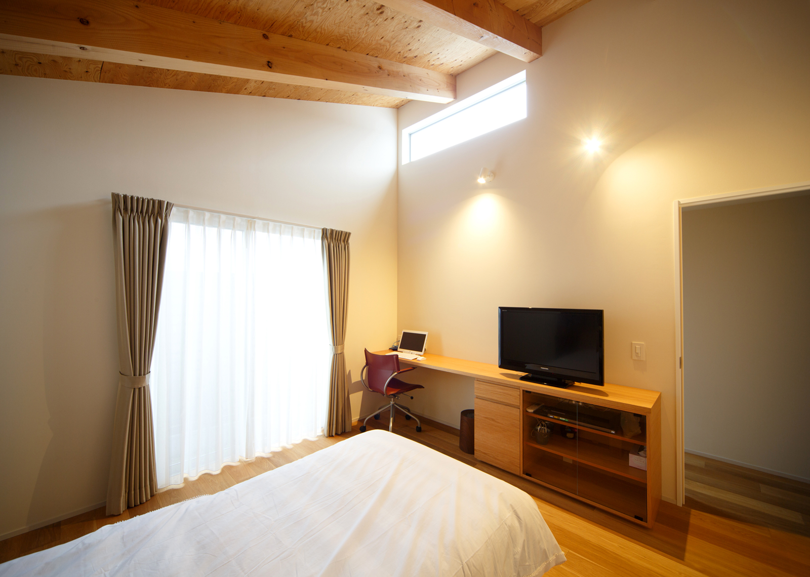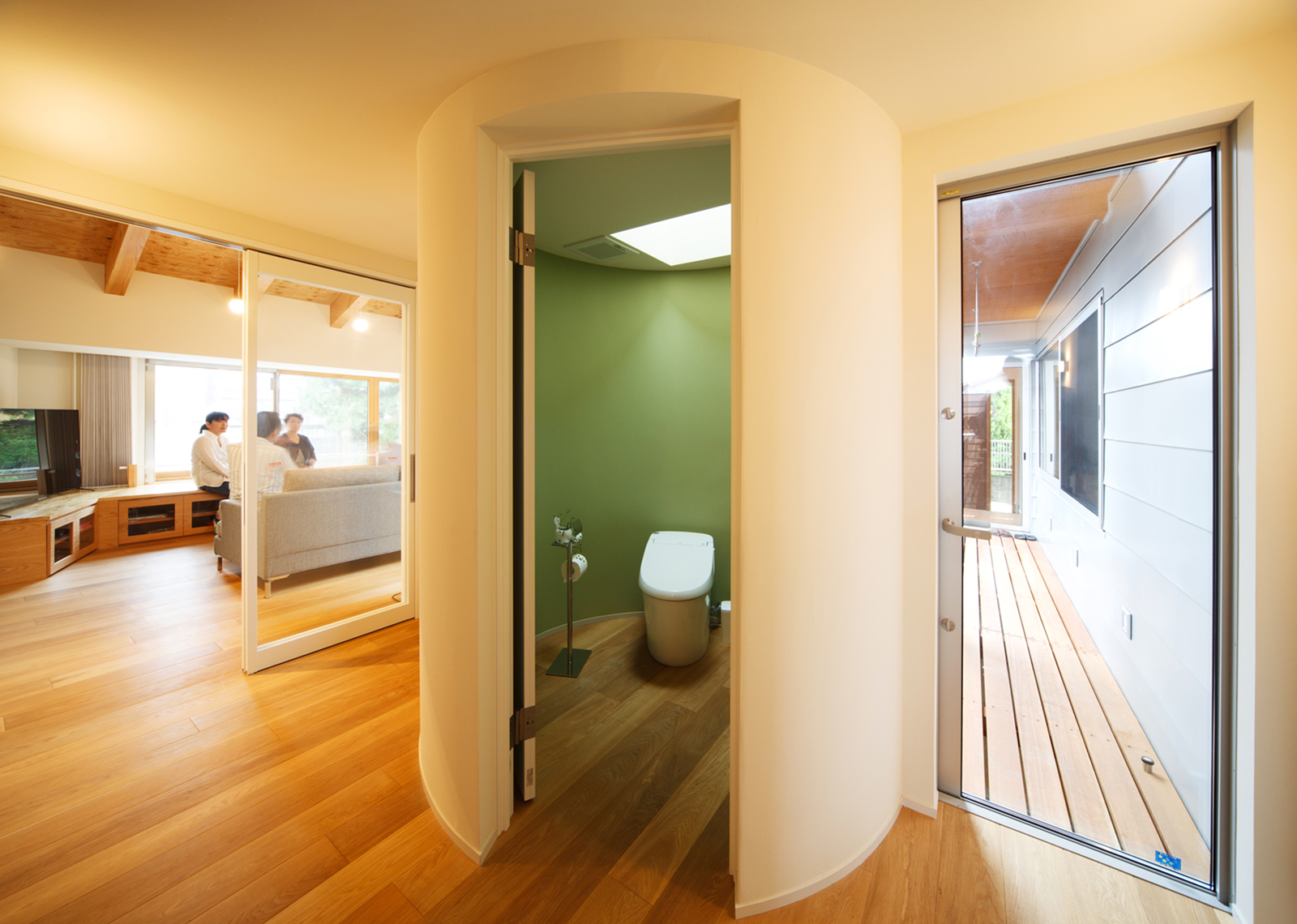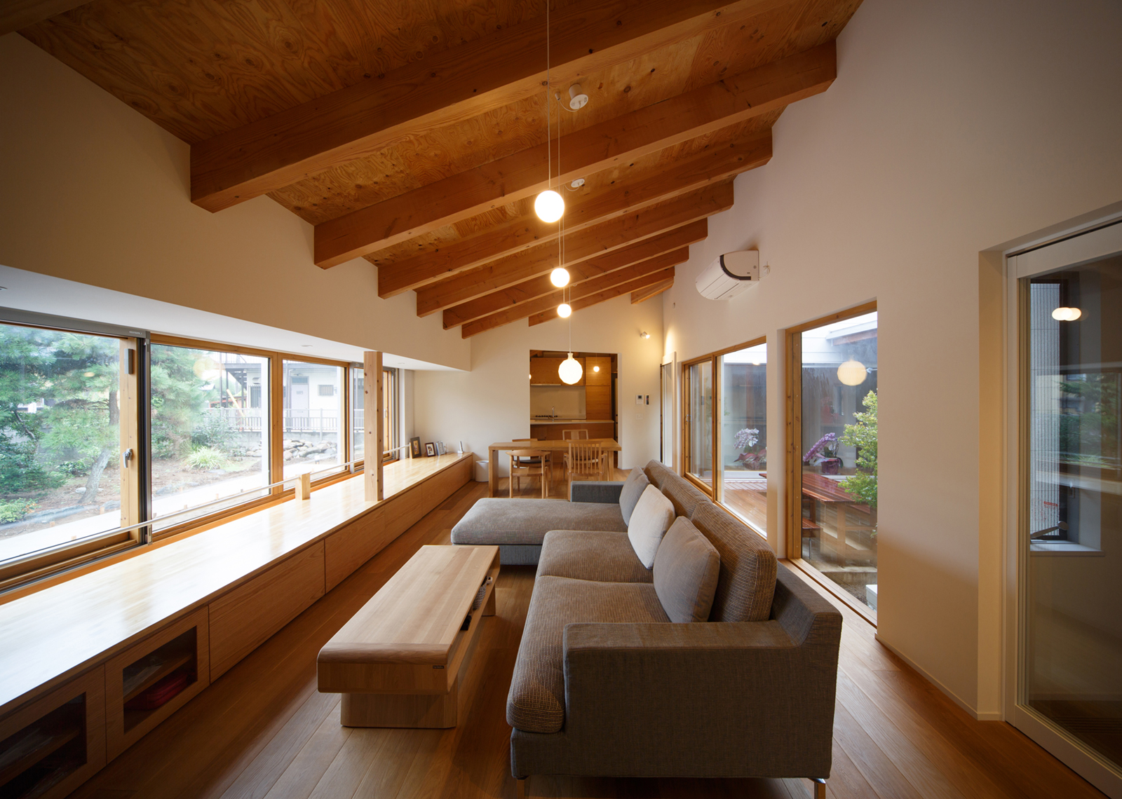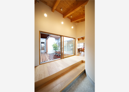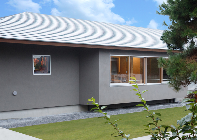 この場所に50余年、住まわれてきた施主様は、以前の家と同じ『平屋建て』を希望され、具体的な要望リスト(30~40項目)を受け取り、計画が始まりました。要望とは別に、各部屋に光と風が行き届く、家の中を廻れる回遊動線、部屋同士のプライバシー、奥様の家事動線、普段の家での過ごし方やコレクションなど、プランで注意した事は、家にいる時間が違うご夫婦と娘さんが、いかに自然に気持ち良く、お互いの生活を送る事ができるかです。中庭デッキを中心にした開放的な家の中で、動線をくっきり分けるのでわなく、使い方によってお互いのプライバシーが確保出来るように考えられています。