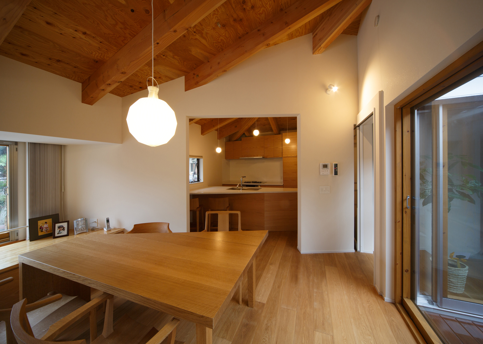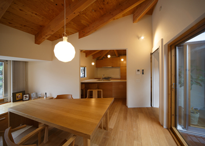 建物は、軒の出た在来工法の登り化粧梁工法で、非常に苦労しましたがプレーカットの技術で1寸の狂いも無く綺麗に納まりました。
